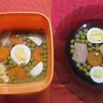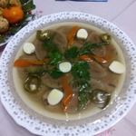 Поверхность залить смесью бульона и желатина, добавляя раствор постепенно, чтобы не нарушить конструкцию заливного.