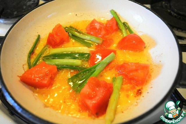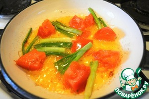 • На сковороде в раскаленном масле обжариваем нарезанные соломкой лук и крупными кусочками помидор. Буквально пару минут.