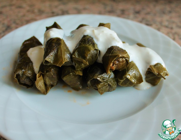Достать из воды листья и вырезать из них стебель (самую жесткую часть). Далее на лист выложить немного мясной массы и скручивать, как указано в видео.