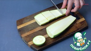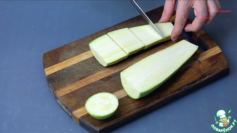 • Режем кабачок крупными кусочками. Сало нарезаем тонкими ломтиками.
