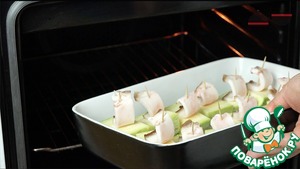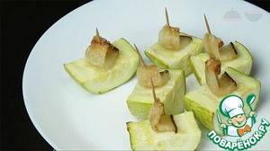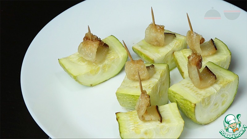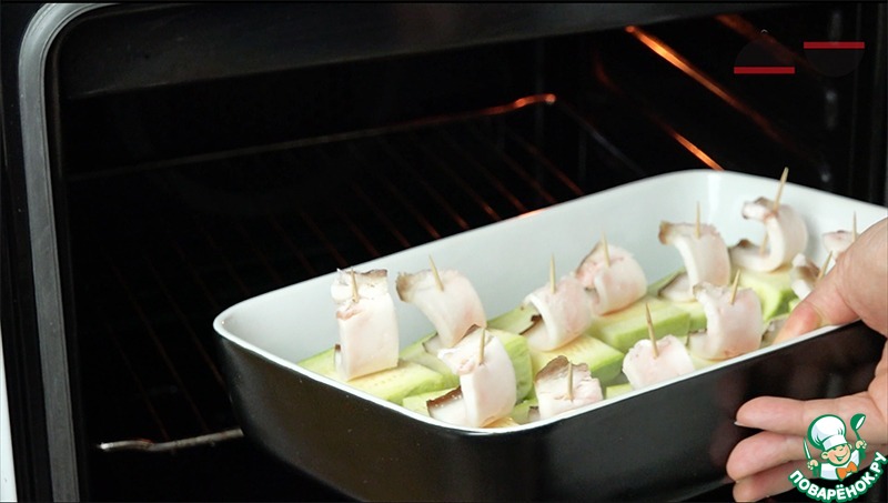 • Зубочисткой прикрепляем сало к кусочку кабачка. Солим. Выкладываем в блюдо для запекания и отправляем в духовку. Готовим 30 минут при 200˚C