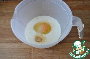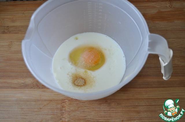 Добавляем сахар, соль, яйцо, взбиваем миксером или венчиком до однородного состояния. -