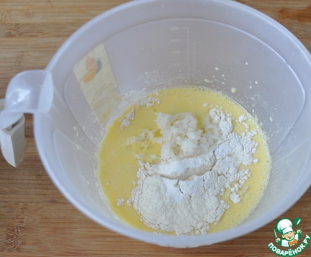 Добавляем просеянную муку, разрыхлитель и заваренные рисовые хлопья. Перемешиваем, чтобы не было комочков.