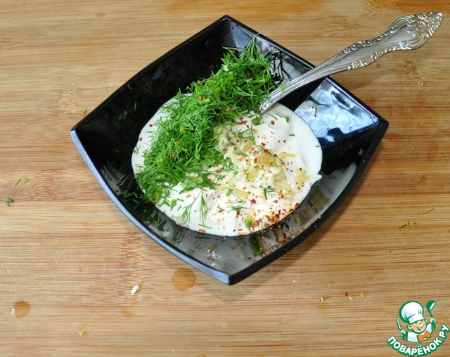 Готовим соус. Смешиваем холодный мацони, соль, перец чили, выдавленный чеснок и укроп, перемешиваем.