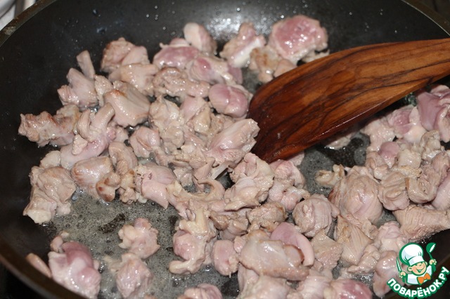 Филе бедра индейки порезать кубиками. Печень порезать кусочками. Разогреть на сковороде растительное масло,