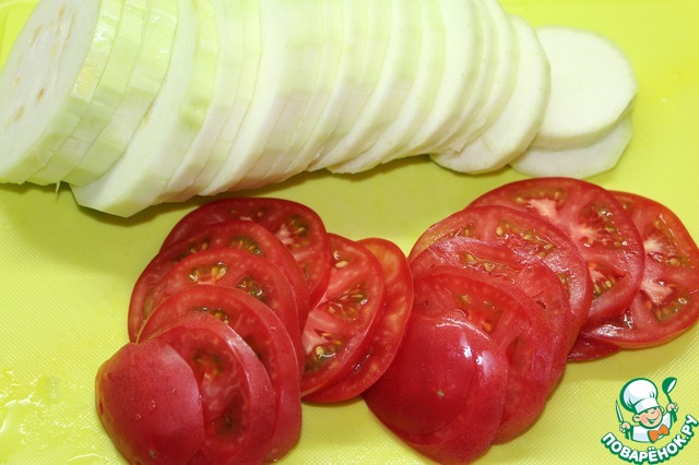 В огнеупорную форму выкладывать овощи слоями картофель, кабачок, помидоры, смазывая понемногу каждый слой сырной-хлебной смесью.