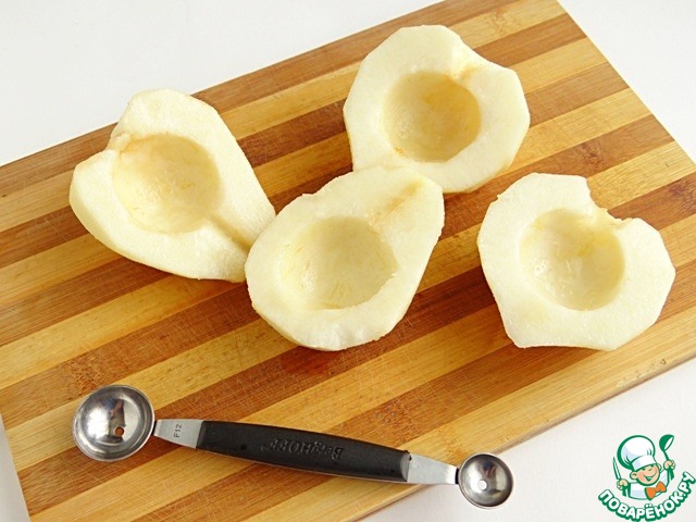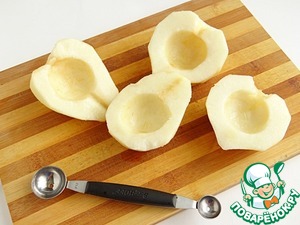 Для приготовления этого десерта чаще я использую сочные и средние по мягкости груши. Пока шоколадная масса остывает, груши мою, обсушиваю с помощью бумажного полотенца. Разрезаю фрукты пополам, удаляю хвостики. С помощью ложки нуазетки удаляю сначала семена, затем еще немного мякоти, чтобы углубление стало чуть больше. Если готовить данный десерт из жесткой груши, рекомендую ее после очищения на 1-2 минуты поместить во включенную микроволновую печь (мощность 900 Вт).