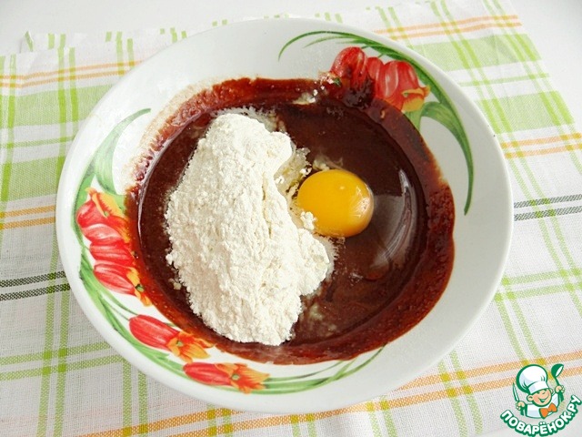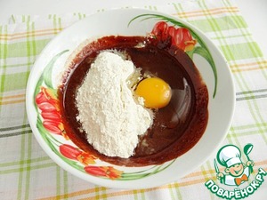 Добавляю в шоколадную смесь яйцо (лучше брать не крупное яйцо), муку, просеянную с разрыхлителем.