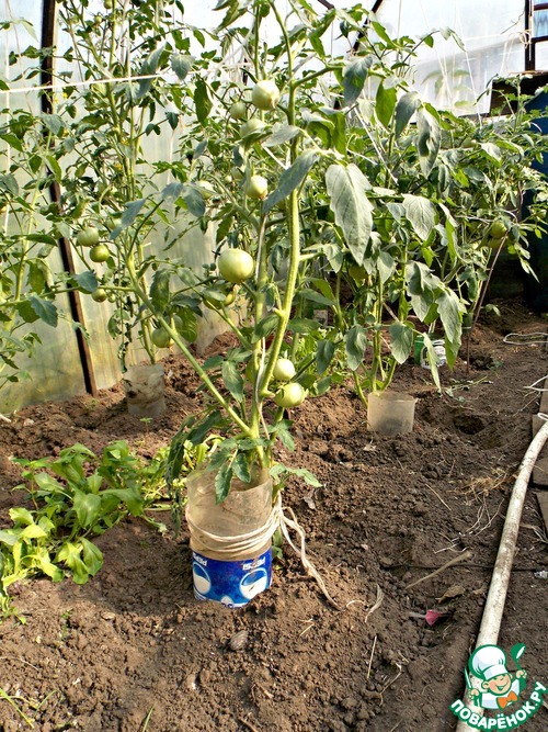 Небольшой совет для тех, кто выращивает томаты в теплице, и проблема с водой. При посадке кустиков помидоры я вставляю в лунку полиэтиленовую бутылку открытым горлышком вниз и с отрезанным дном. Первые 2 недели я поливаю на землю, а затем полив произвожу непосредственно в бутылки. Так вода полностью поступает к корню, земля всегда остается рыхлой, и сорняки не так сильно донимают. Так как воду им брать просто неоткуда (в междурядье растет салат).