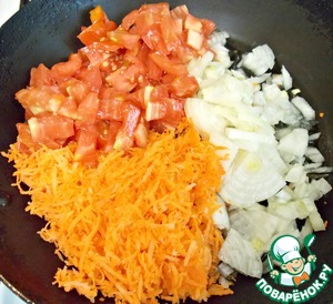 Лук мелко нарезать, морковь натереть на мелкой терке, помидоры нарезать кубиками. Посолить, поперчить, добавить оба вида масла и обжаривать 5-6 мин.