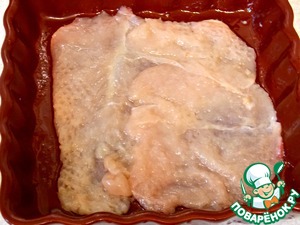 Куриную грудку нарезать ОЧЕНЬ тонкими пластинами. Отбить, уложить несколько штук в смазанную маслом форму тонким слоем. Смазать белком, который немного взбить с щепоткой соли.