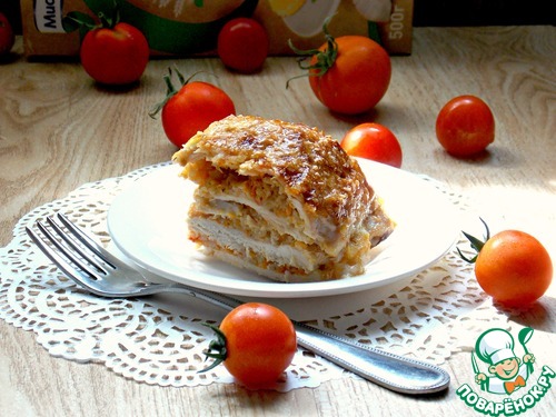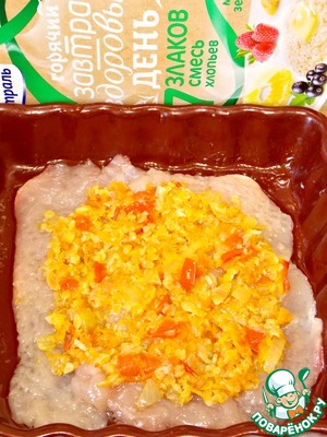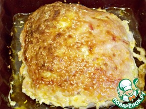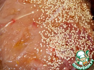 Сверху снова слой филе и опять начинка. КАЖДЫЙ слой филе смазываем белком. Последним должно быть филе. Смазать белком и посыпать кунжутом. Ставим в духовку при t=180 на 40 мин.