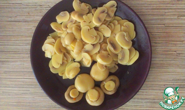 Маринованные шампиньоны порезать тоненькими пластинами, пару грибочков оставить на украшение.