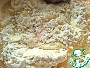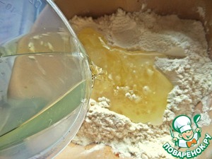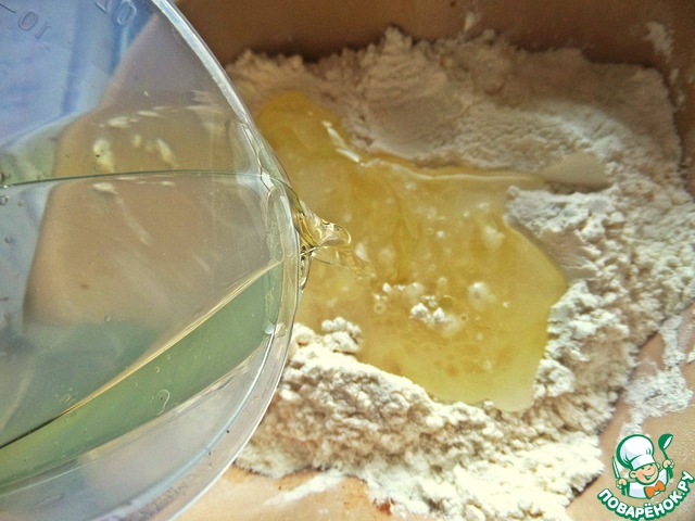 В обычную муку вмешать ложку ржаной по желанию, сделать ямку и влить жидкий состав.