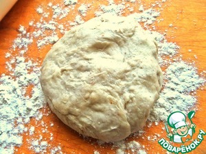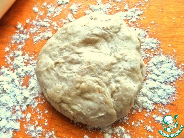 Далее месим тесто на присыпанной мукой доске и оставляем колобок полежать накрытым около получаса или дольше.