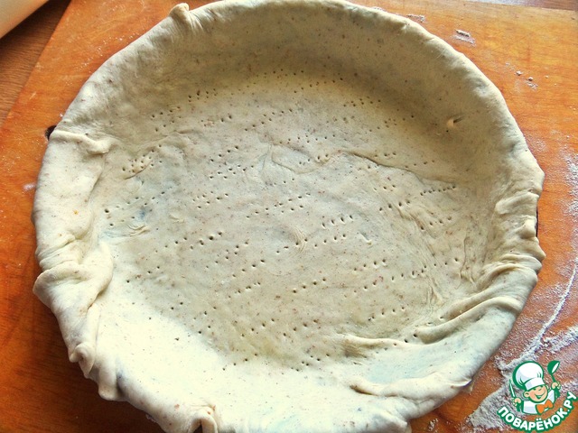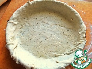 Намотать пласт на скалку и перенести в смазанную тефлоновую форму 26 см в диаметре, закинуть края за бортики.