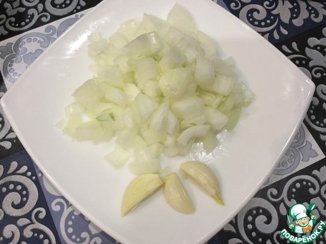 Лук нарезать кубиками, зубчики чеснока разрезать пополам.