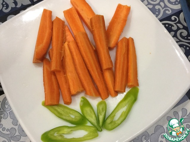 Морковь порезать кубиками. Однако, мои мужики ( муж и сын) не любят морковь, а без неё никак... Поэтому, я режу морковь крупными брусочками, что бы легко было убрать из порции.