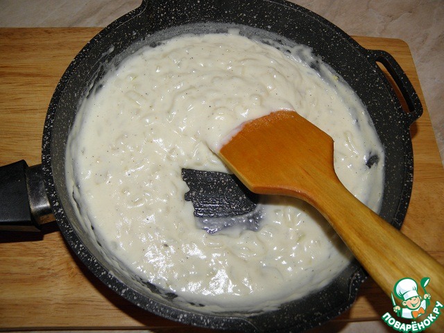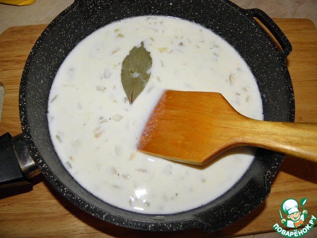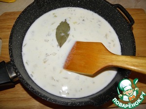Тонкой струйкой влить молоко, непрерывно помешивая, добавить лавровый лист