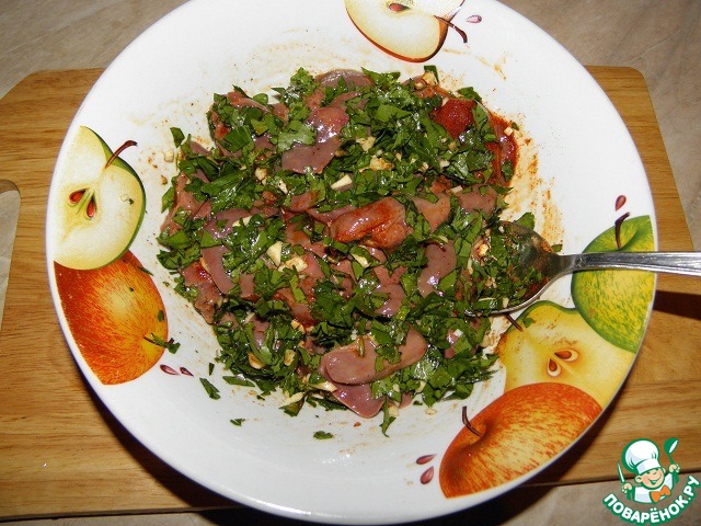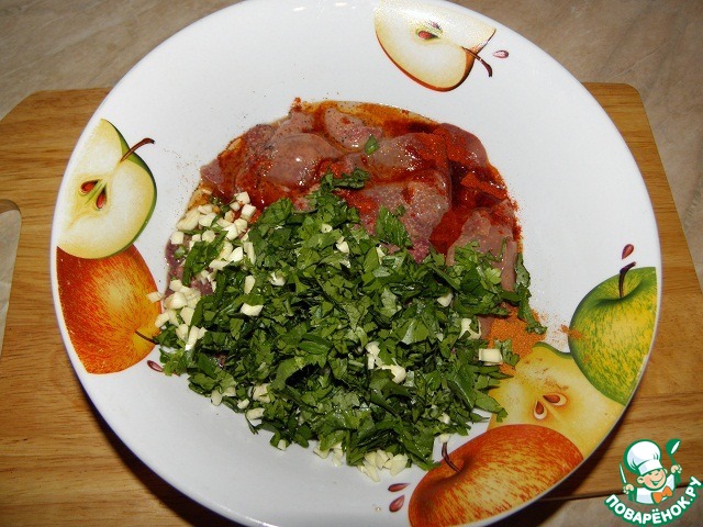 Добавить к подготовленной печени ( мыть, удалить все лишнее)