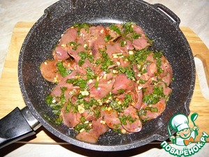 Разогреть растительное масло на сковороде, выложить печень в маринаде