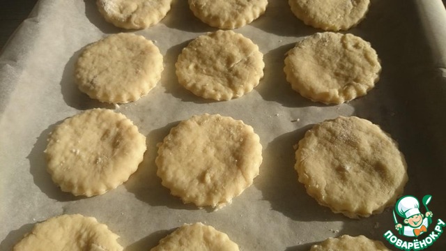 С помощью круглой формочки для печенья, вырезаются кружки, которые помещаются на застеленный бумагой противень и смазываются смесью хорошо взбитого яйца и воды, а затем отправляются в разогретую до 200 градусов до подрумянивания на 15-20 минут. -