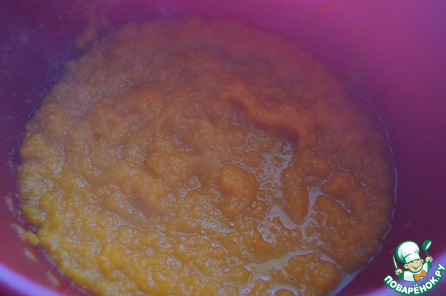 Морковь выкладываем в емкость для замеса, добавляем отвар и разбиваем блендером.