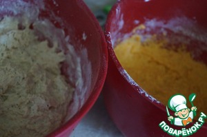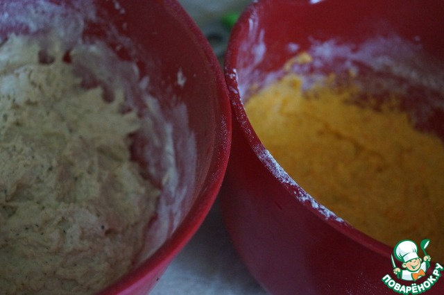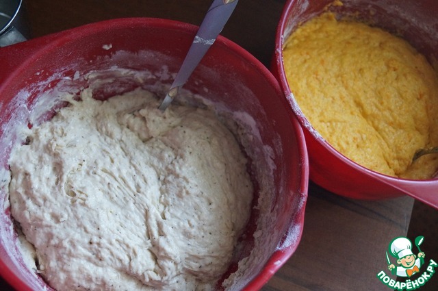 Тесто мы будем делать одновременно в разных емкостях, поэтому морковь отварить заранее и остудить, не сливая отвар, до тёплого состояния. -