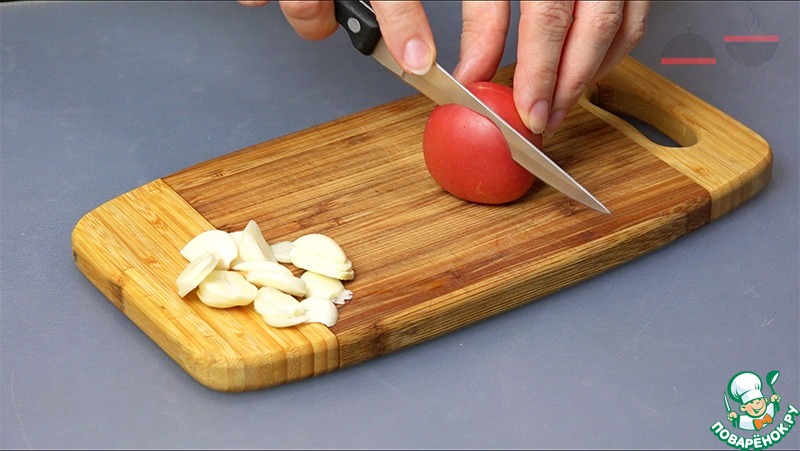 Нарезаем чеснок и помидоры. Затем надрезаем перец и "начиняем" его. -