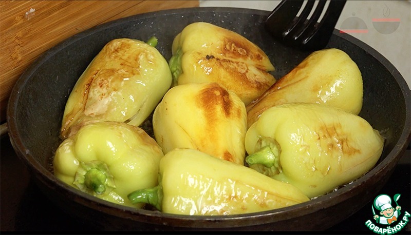 Выкладываем перчик на сковороду с разогретым растительным маслом, солим и жарим со всех сторон. Жарим под крышкой!