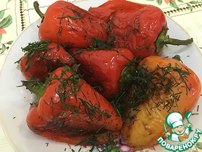 Готовый перчик выкладываем в блюдо, заправляем уксусом и посыпаем мелко нарезанной зеленью. Можно подавать!