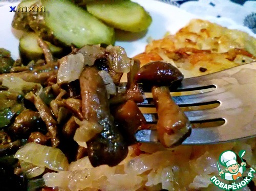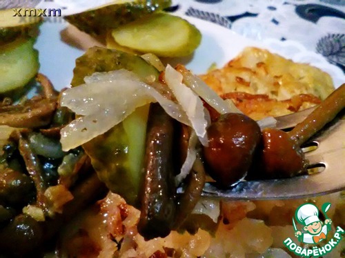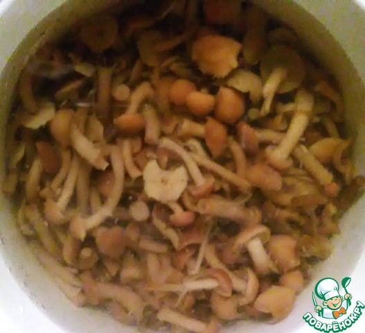 Когда лук размягчился, отправляем грибы к луку и обжариваем без крышки до того состояния как вам по душе. Я люблю жарить до тех пор пока они начинают "стрелять". Но будьте внимательны. Они начинают брызгать маслом.