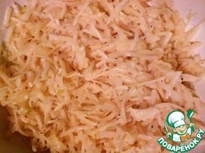 Трем на терке картофель и вместе с луком складываем в миску. Чтобы картофель не потемнел, добавляем две столовые ложки яблочного уксуса и перемешиваем всю массу.