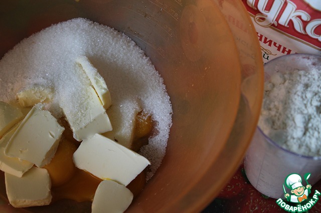 Для теста 4 желтка хорошенько растереть с сахаром и сливочным маслом. Всыпать просеянную муку, разрыхлитель и замесить тесто не липнущее к рукам. Оно получается достаточно тугое.