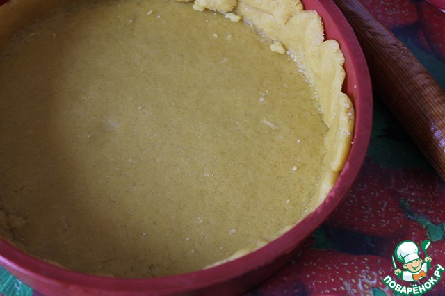 При помощи скалки раскатать тесто по диаметру своей формы для выпечки. Переложить его, формируя бортики 3-3,5 см высотой.