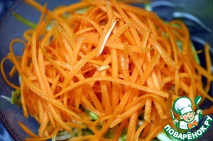 Кабачок натереть на тёрке для моркови по-корейски. Можно кабачок не чистить