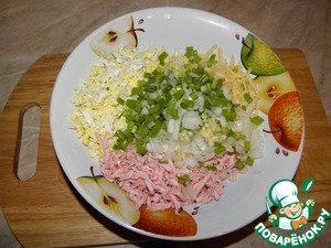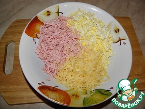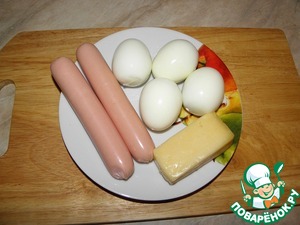 Натереть на крупной терке сосиски, сыр и яйца