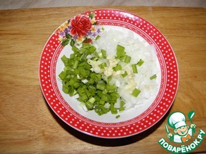 Чеснок, репчатый лук и зеленый лук измельчить (чеснок можно через пресс)