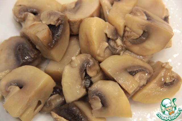 Грибы помыть, если берете вешенки или шампиньоны. Лесные грибы должны быть отварены. Можно их разрезать, но я оставила маленькие целыми, а побольше разрезала пополам.