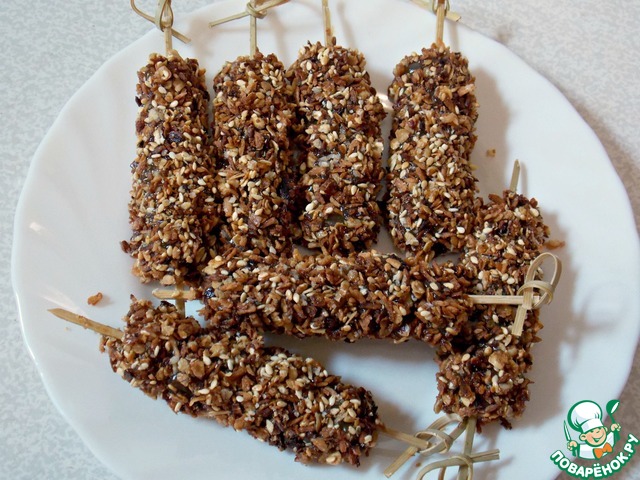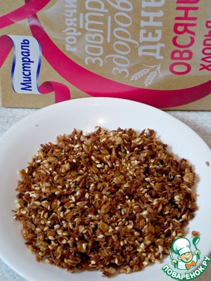 В хлопья "Экстра" от фирмы "Мистраль" добавить кокосовую стружку, кунжут и сахар "Кристаллы" от "Мистраль".