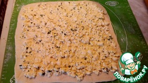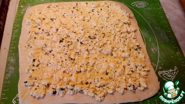 Раскатать тесто в пласт толщиной 3-5 мм. Выложить начинку ровным слоем, отступая от краев 1 см.