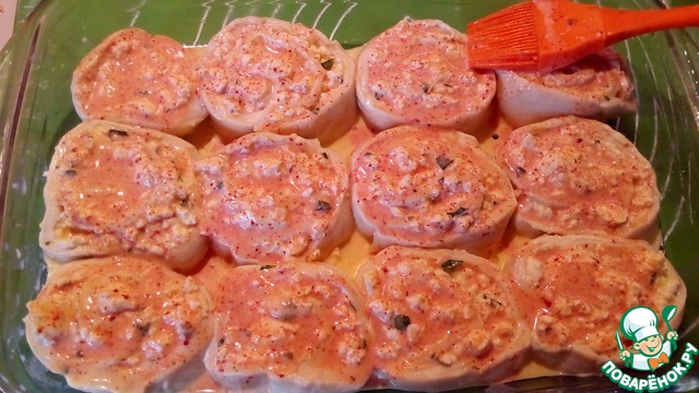 Свернуть тесто в довольно плотный рулет и разрезать поперек на 12 частей. Разогреть духовку до 180 градусов, смазать маслом прямоугольную форму. Выложить в нее булочки срезом вверх. Приготовить заливку: взбить вилкой желток с оставшейся сметаной, посолить, приправить паприкой. Смазать булочки этой смесью.