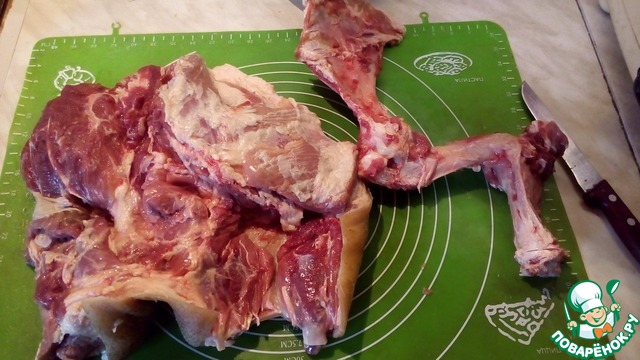 • Духовку разогреть до 250 градусов. Лопатку уложить на рабочую поверхность кожей вниз и, сделав надрезы, аккуратно извлечь кость. Если кости в вашем мясе нет, то сделайте несколько надрезов так, чтобы получился пласт. Посолите и поперчите по вкусу.