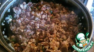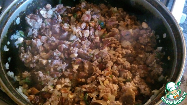 • В сковороду влить 3 ст. л. растительного масла, обжарить мелко нарезанный лук до прозрачности. Добавить печень, порезанную кусочками и фарш. Жарить 5 минут, периодически помешивая. Добавить порубленный миндаль, изюм, травы, петрушку, посолить, поперчить. Влить 2 ст. л. вина, перемешать, снять с плиты. Остудить.