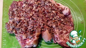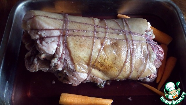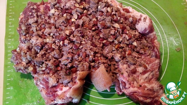 • Получившийся фарш распределить по пласту свиной лопатки и свернуть ее рулетом. Посолить, поперчить, хорошо натереть растительным маслом.
