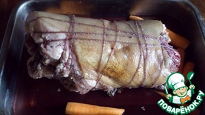 • Очищенную морковь выложить на дно глубокого противня, туда же уложить рулет. Полить оставшимся красным вином, добавить немного воды и запекать 30 минут.