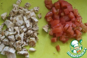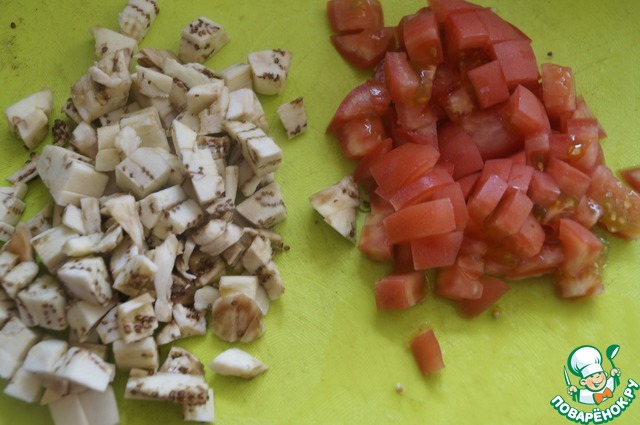 Мякоть баклажана нарезать мелким кубиком, помидор тоже нарезать кубиком.