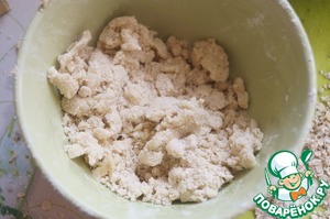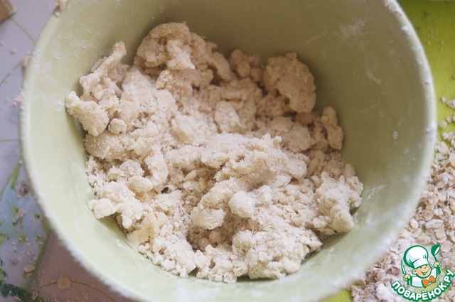 В чашу выложить холодное сливочное масло, всыпать молотые овсяные хлопья и муку, посолить и растереть все в крошку.