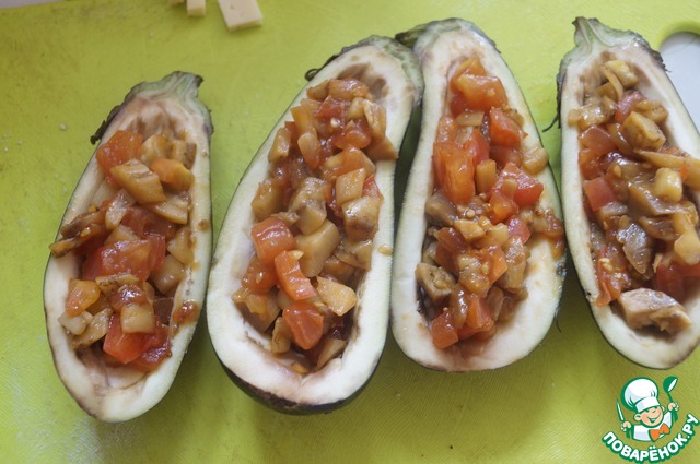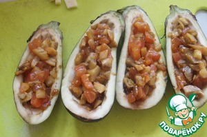 Баклажанные лодочки вынуть из воды, выложить в глубь лодочки подготовленные овощи.