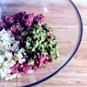 Добавить в фарш обжаренный лук, нарезанные корнишоны, горчицу, кориандр и воду.